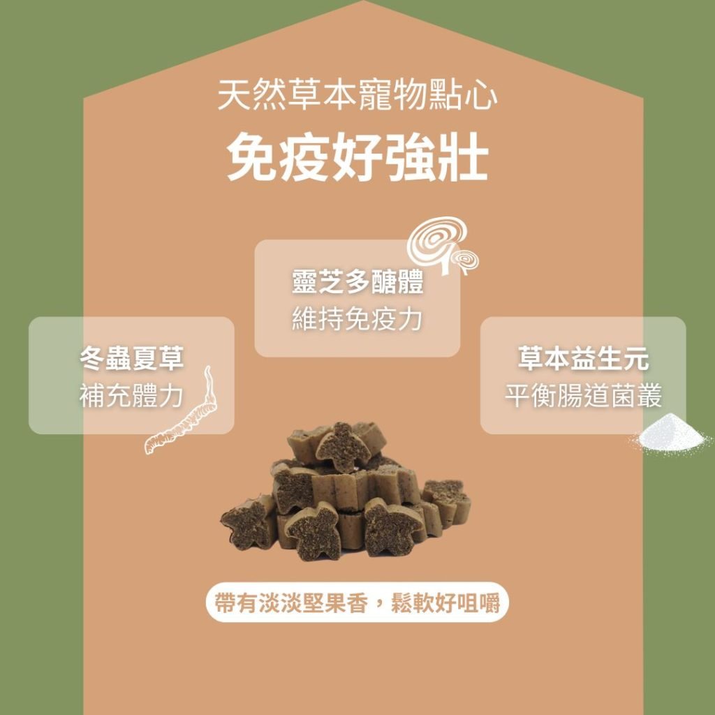 成分:馬鈴薯、植物甘油、黑水虻、布拉氏酵母菌、甘露寡糖 (萃取自酵母)、冬蟲夏草、靈芝、豌豆纖維、歐芹、紅薯、酵母萃取、碗豆蛋白、食鹽、玉米糖膠、植物油、山梨酸鉀、維生素和礦物質、天然抗氧化劑