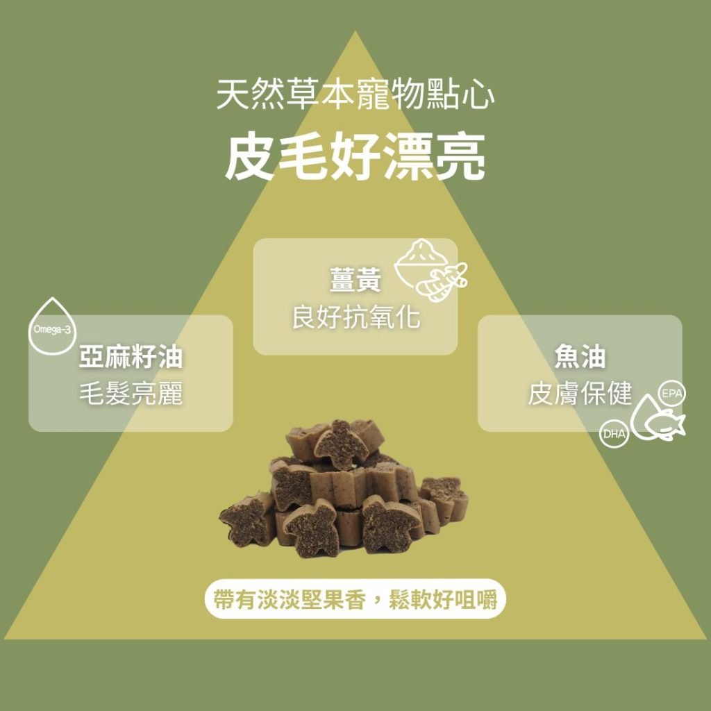 成分:馬鈴薯、植物甘油、黑水虻、亞麻籽油、魚油(EPA、DHA)、薑黃、海帶、甘氨酸鋅、歐芹、紅薯、酵母萃取、碗豆蛋白、食鹽、玉米糖膠、植物油、山梨酸鉀、維生素和礦物質、天然抗氧化劑