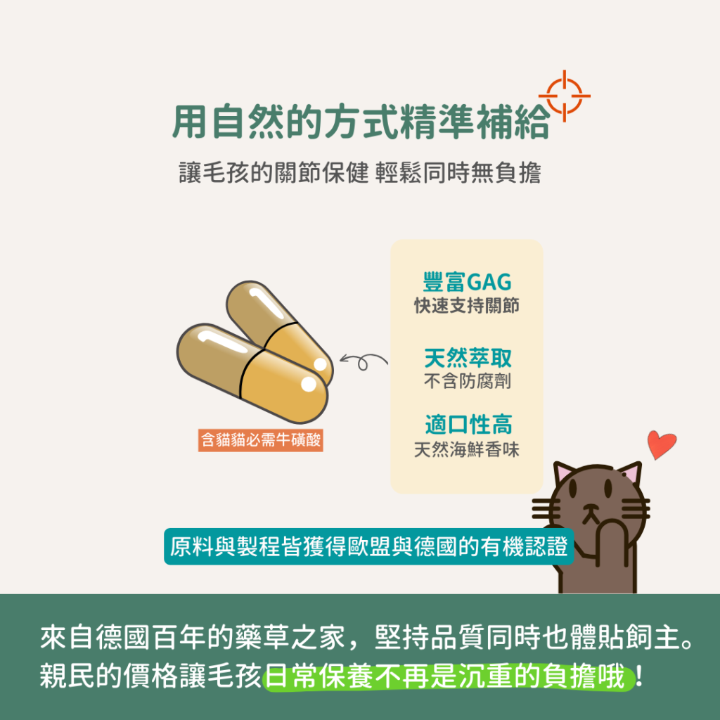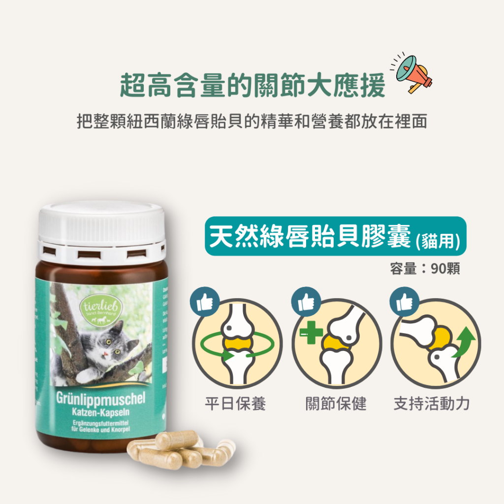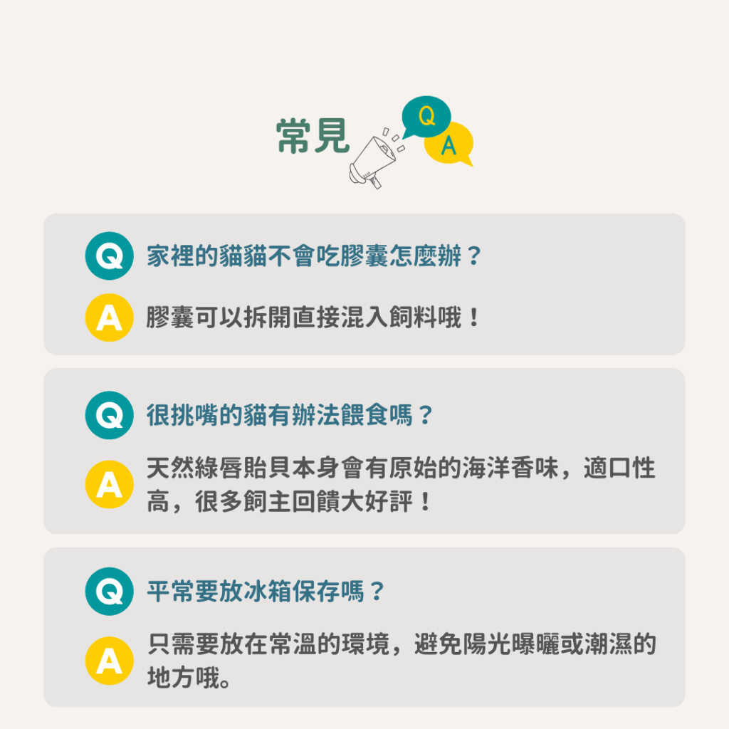 來自紐西蘭的天然綠唇貽貝(Perna canaliculus),含有豐富的蛋白質與omega-3,保護貓咪關節。而綠唇貽貝中的小分子醣胺聚醣 (GAG),可以快速補充關節所需營養,支持關節健康。並含有貓咪必需胺基酸中的「牛磺酸」。