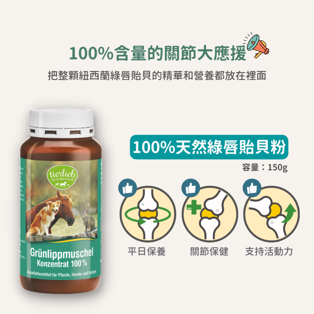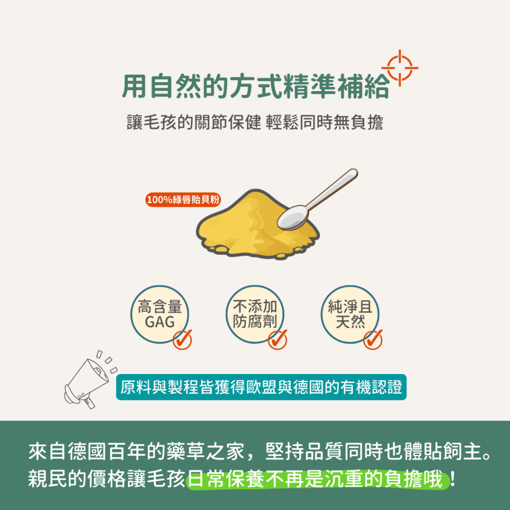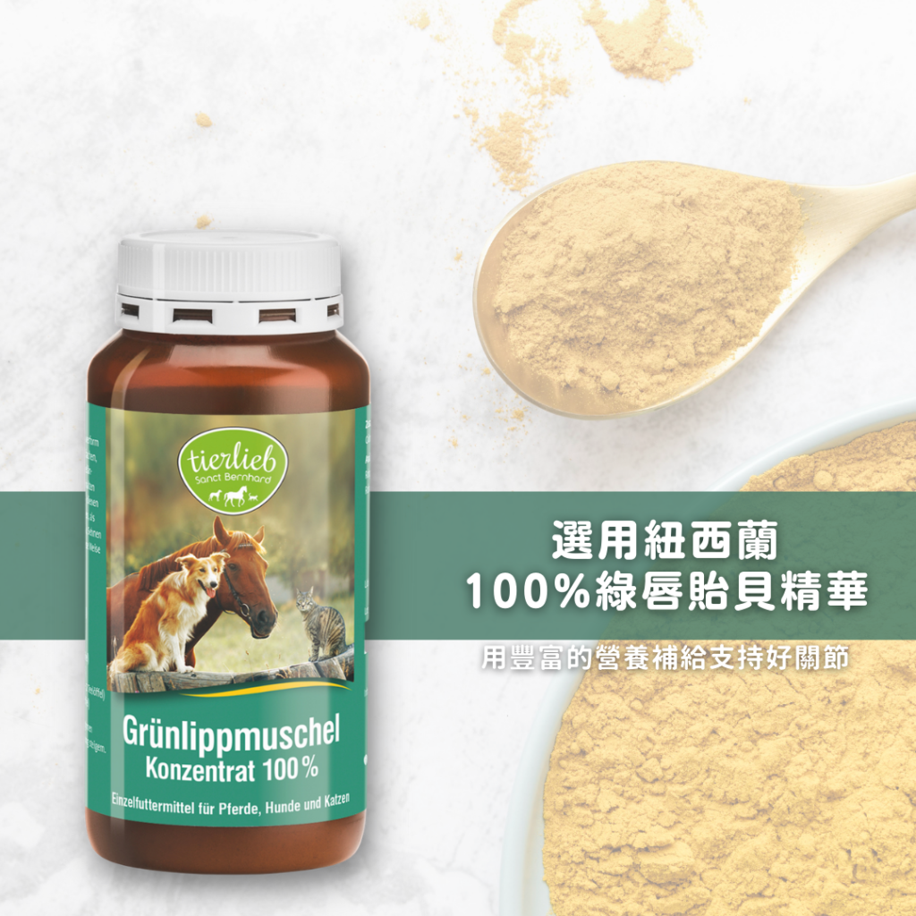 來自紐西蘭的天然綠唇貽貝(Perna canaliculus),含有豐富的蛋白質與omega-3,保護狗狗關節。而綠唇貽貝中的小分子醣胺聚醣 (GAG),可以快速補充關節中滑囊液與軟骨所需的營養,支持關節健康。100% 綠唇貽貝濃縮粉末,可直接添加至飼料中。