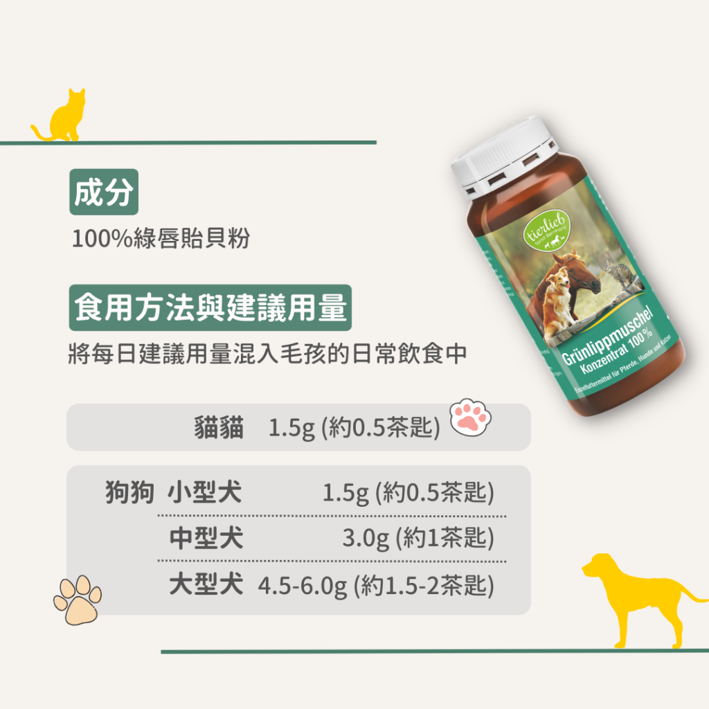 • 狗:小型犬種:1.5克(約0.5匙)