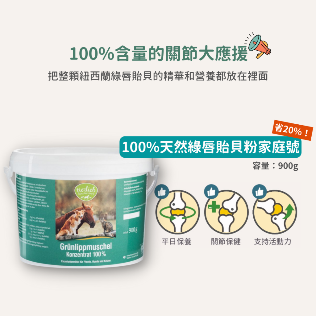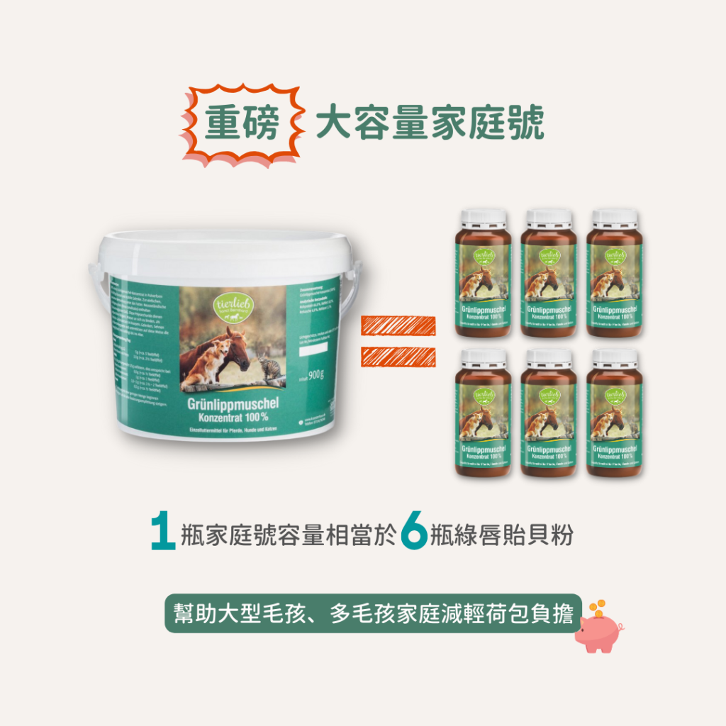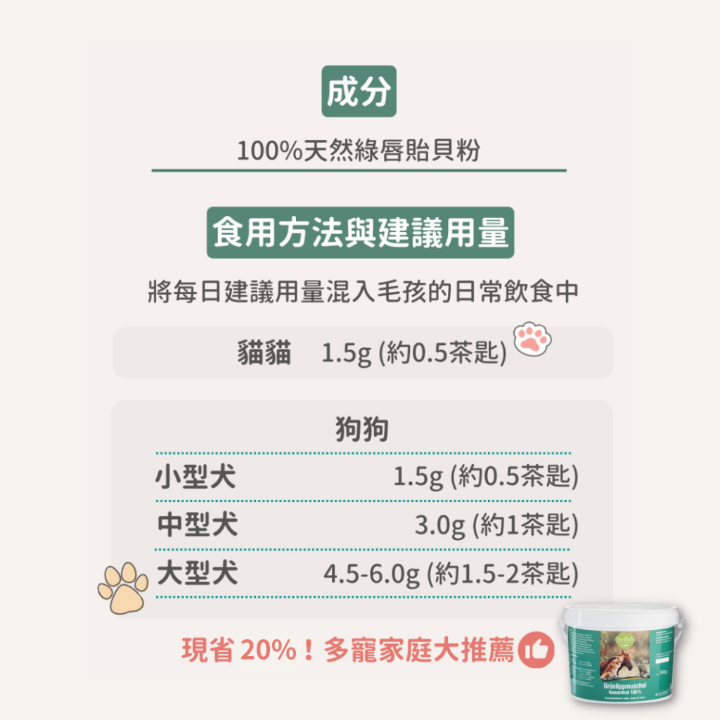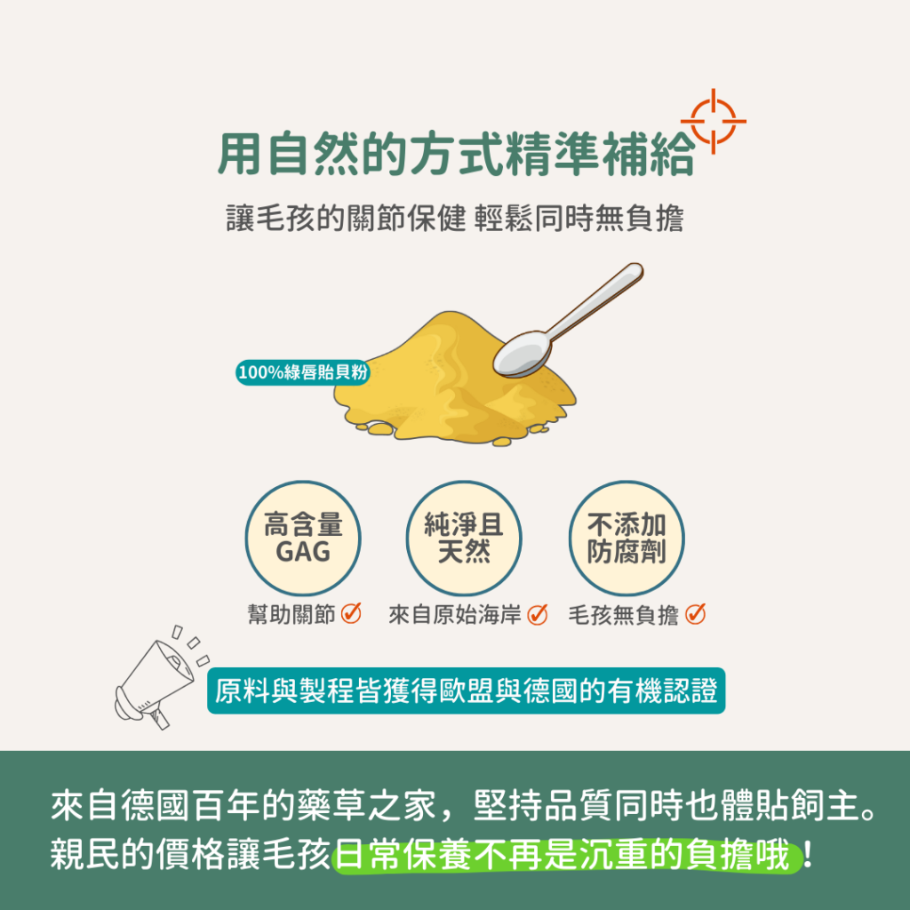 來自紐西蘭的天然綠唇貽貝(Perna canaliculus),含有豐富的蛋白質與omega-3,保護狗狗關節。而綠唇貽貝中的小分子醣胺聚醣 (GAG),可以快速補充關節中滑囊液與軟骨所需的營養,支持關節健康。1瓶相當於6瓶小綠精華,重量級家庭號!現省20%,適合多寵家庭、中大型犬家庭。