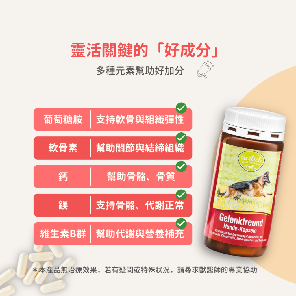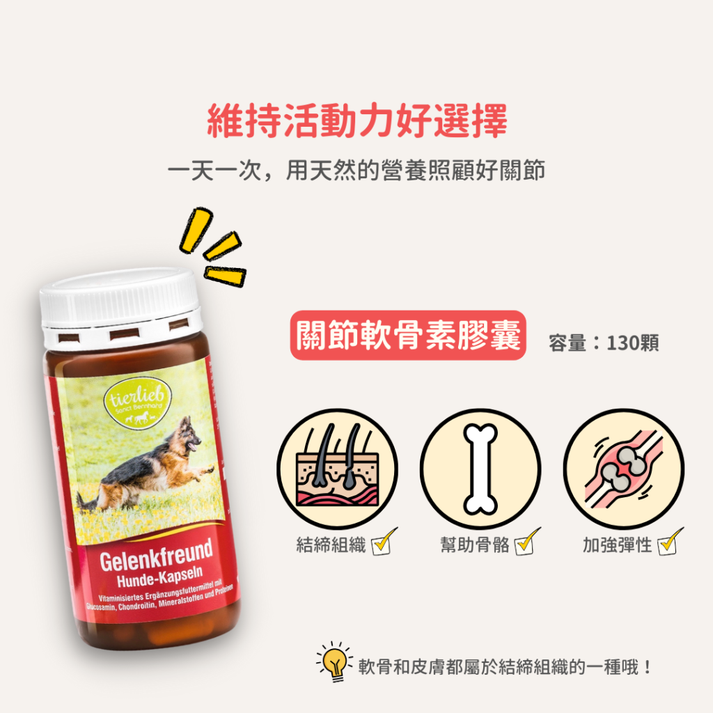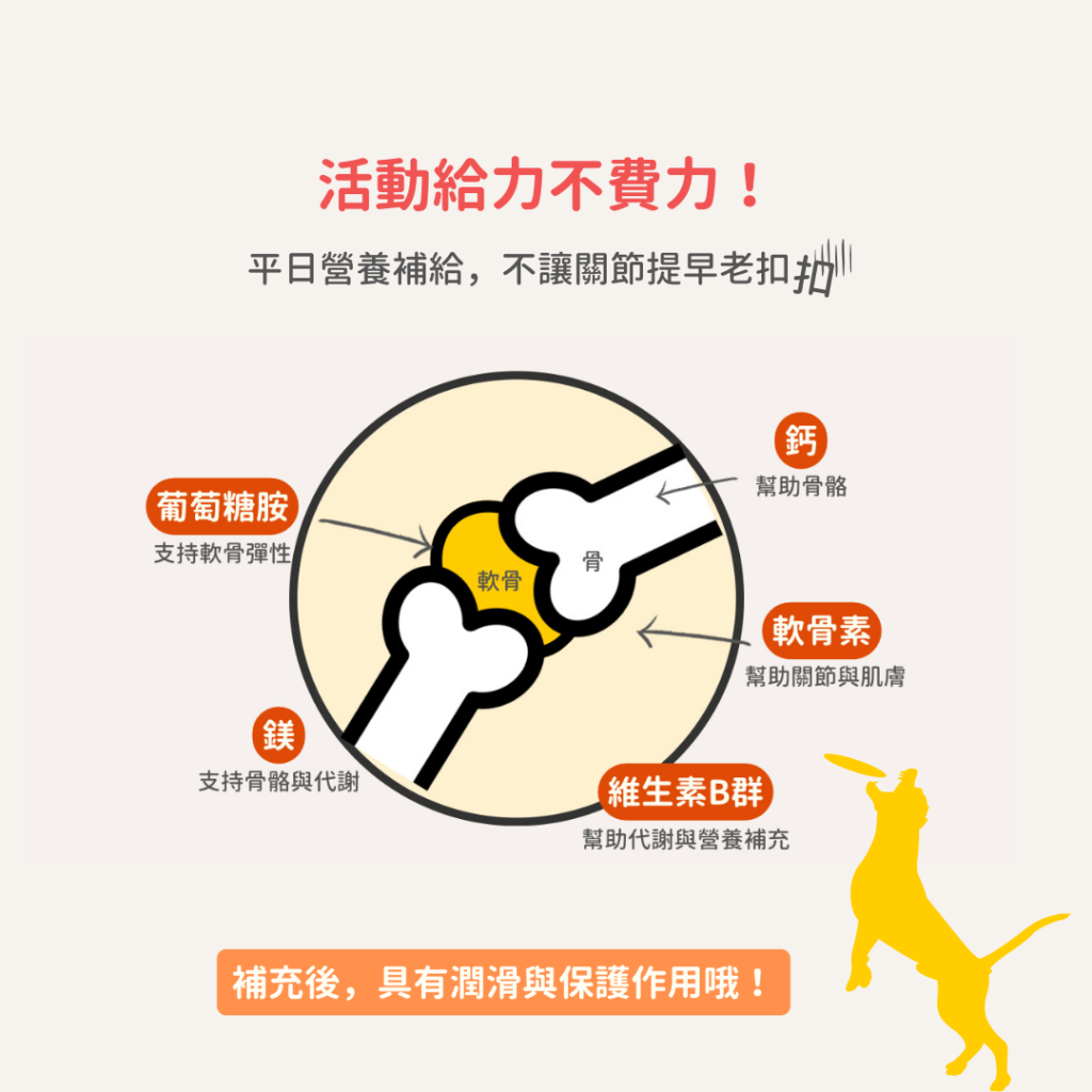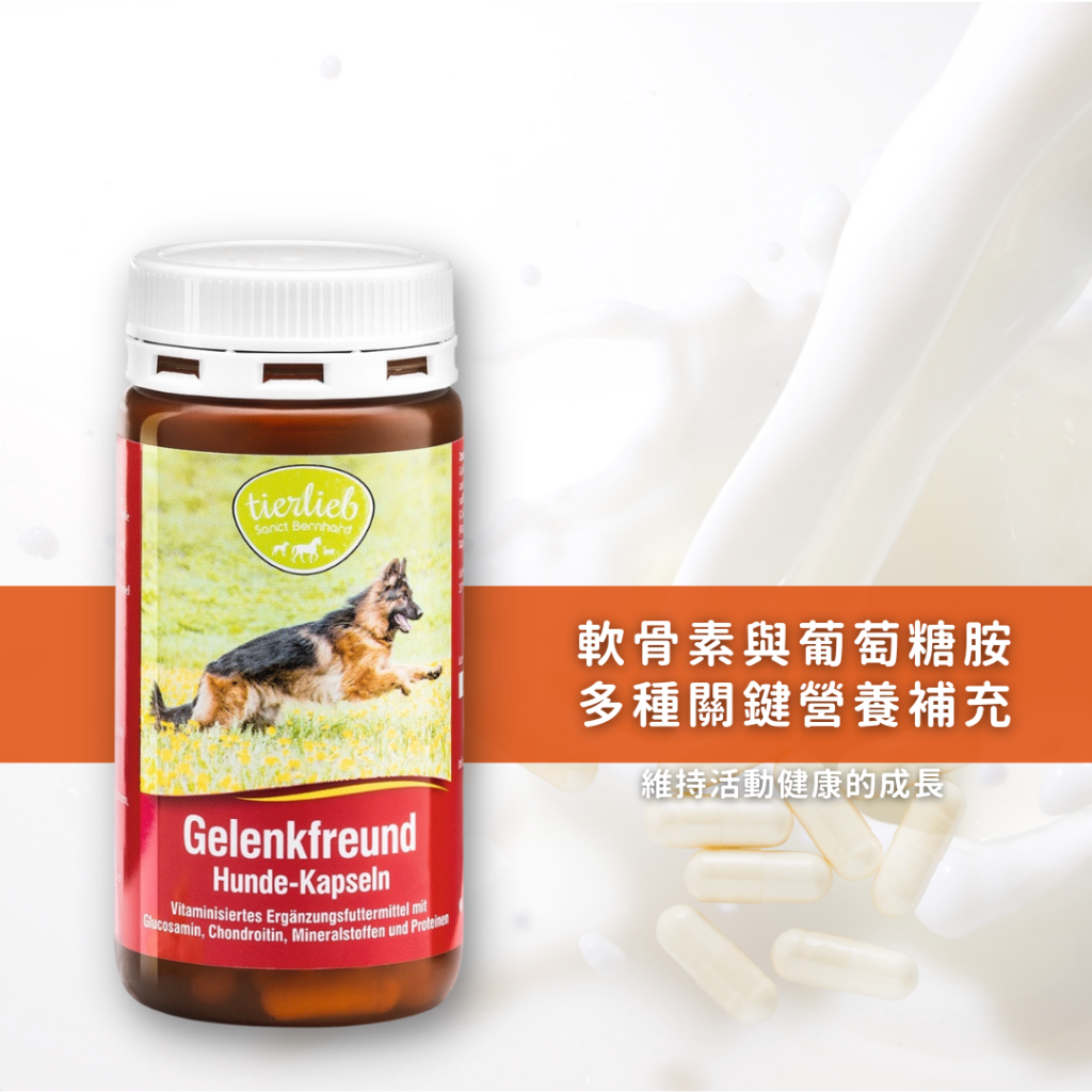 含鈣、鎂、8種重要的維生素B群、黏多醣胺基葡萄糖和軟骨素。狗狗的皮膚、軟骨以及粘膜組織,都是結締組織的組成部分,補充後具潤滑與保護作用。同時成分中的礦物質和維生素幫助狗狗骨骼結構、結締組織和軟骨使其保持彈性和靈活度。