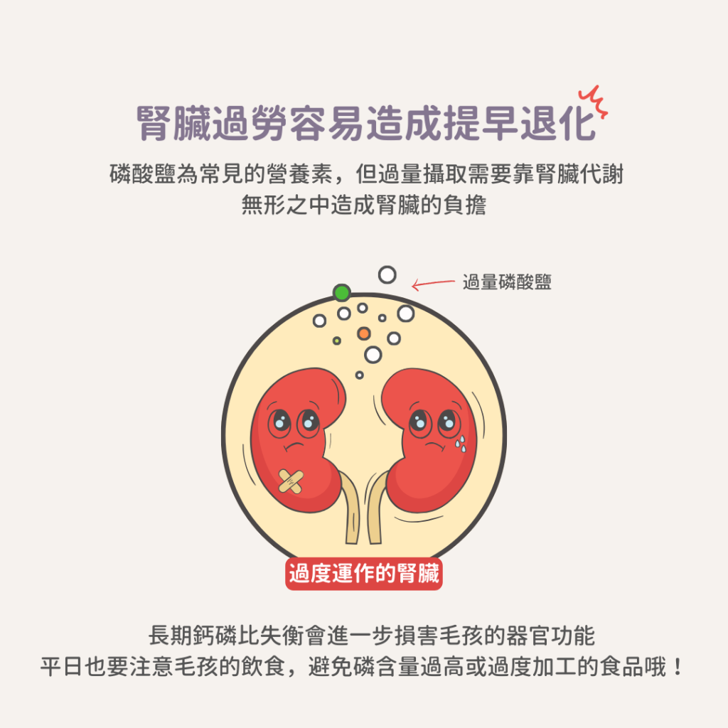 磷酸鹽是貓狗常見的營養素,但攝入過量的磷酸鹽會通過毛孩的腎臟排出體外,增加腎臟代謝的負擔。