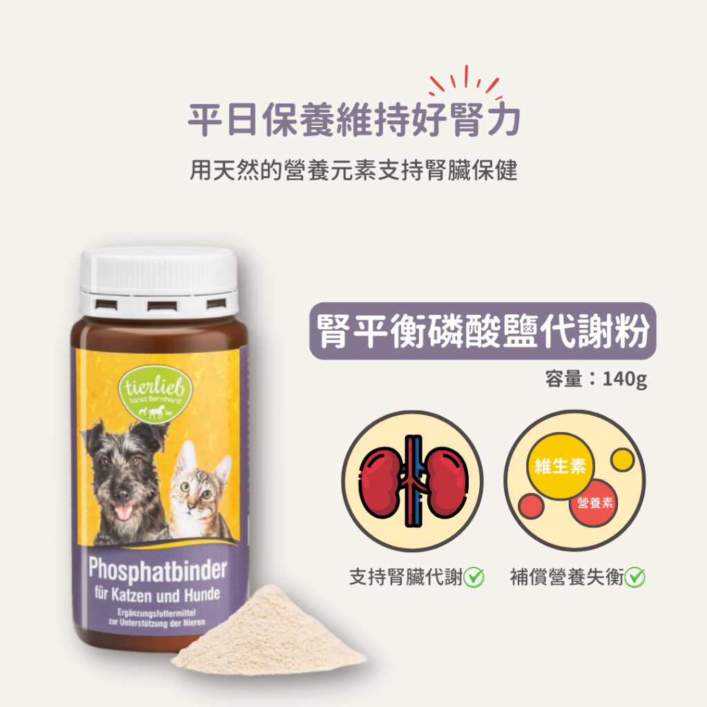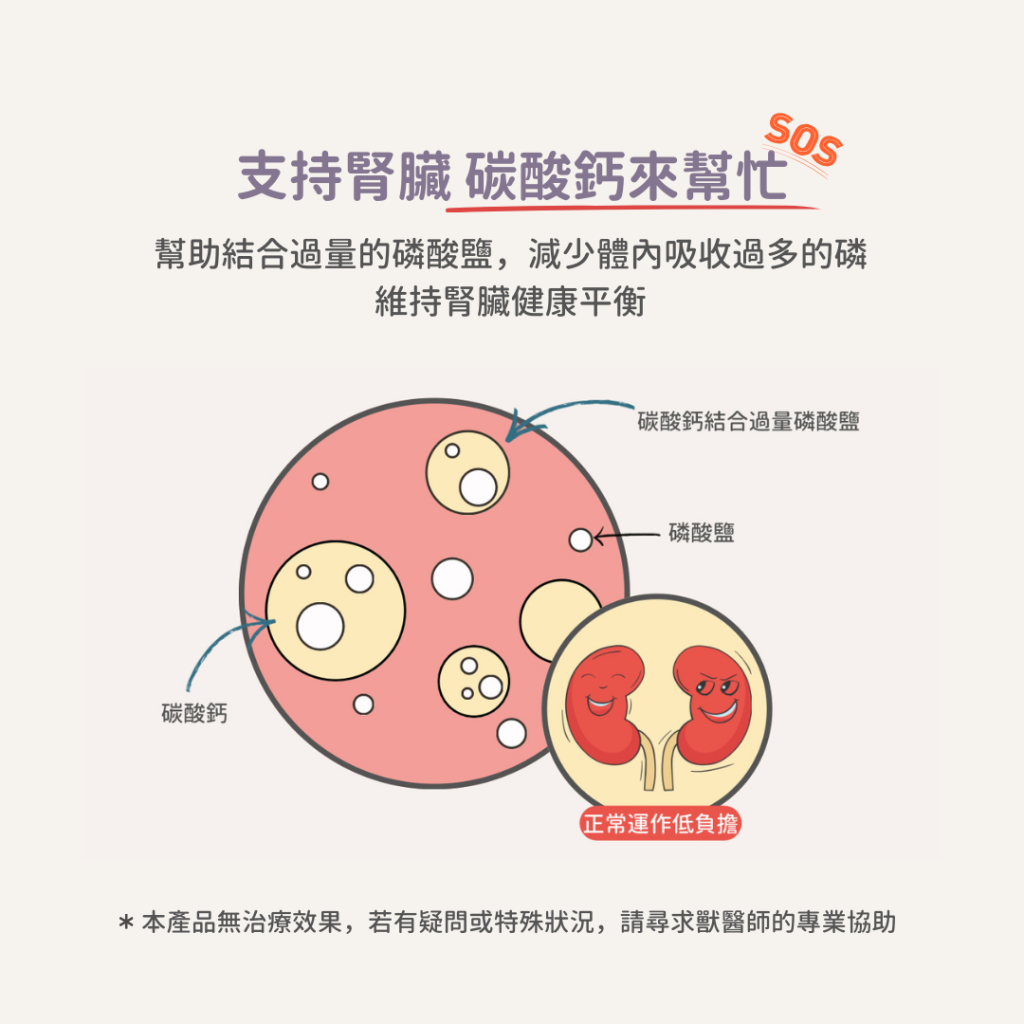 腎平衡磷酸鹽代謝粉含有細緻的碳酸鈣粉末與幾丁聚醣 (殼聚醣) ,可在消化過程中與磷酸鹽結合,減少身體對磷酸鹽的吸收,降低腎臟負擔。此外,還添加了綜合維生素B群和維生素C,幫助通腎臟吸收和代謝之間的平衡,並避免相關缺乏症。