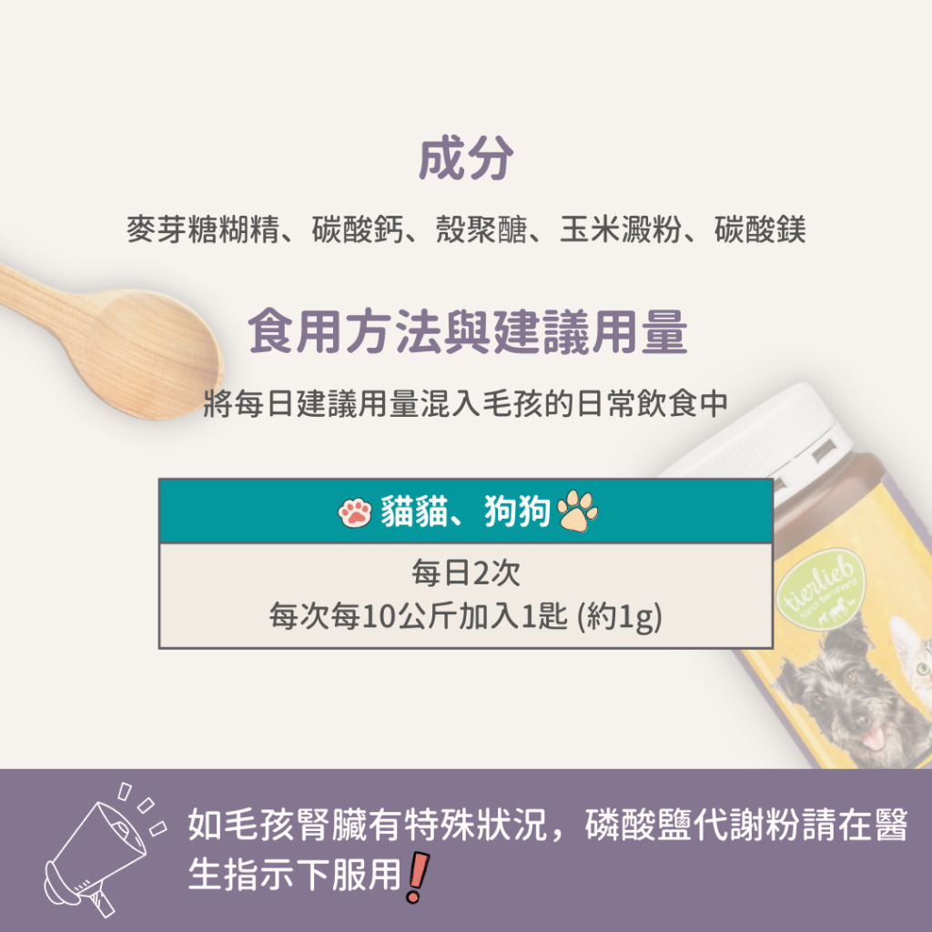 〈不應超過推薦的每日用量。有腎臟疾病的毛孩,磷酸鹽代謝粉只能在諮詢獸醫的情況下餵食,並在必要時調整劑量〉