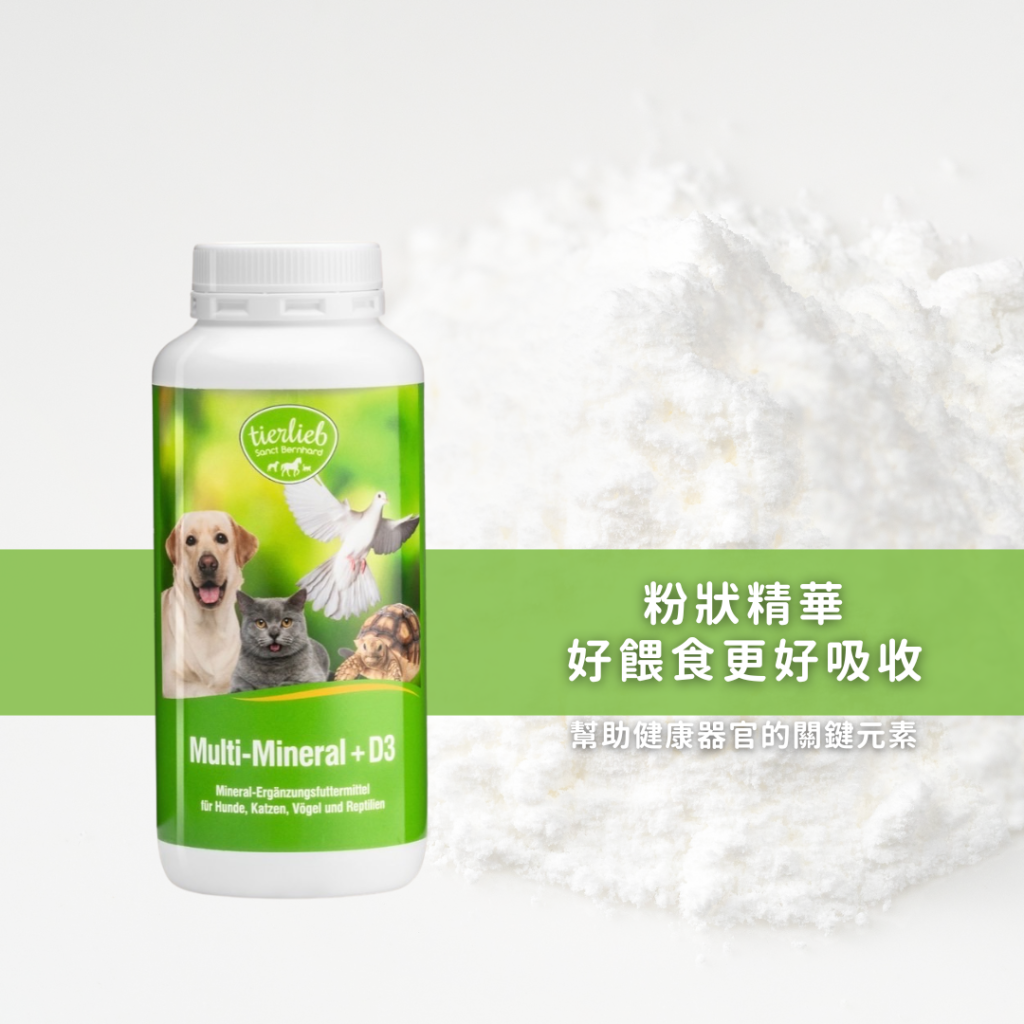 在毛孩發育、年老和繁殖的過程中,骨骼和關節礦物質不足時會嚴重影響結構的發育。D3綜合營養礦物粉提供現成的礦物質、微量元素和維生素D3並防止相關營養缺乏,並含有天然左旋離氨酸,幫助貓咪維持免疫力。維生素D對健康的鈣磷平衡非常重要,能夠支持骨骼、牙齒和蛋殼的發育和完整,並有助於皮膚、皮毛和羽毛的成色。適用鴿子、鸚鵡等鳥類與烏龜、守宮等爬蟲類動物。