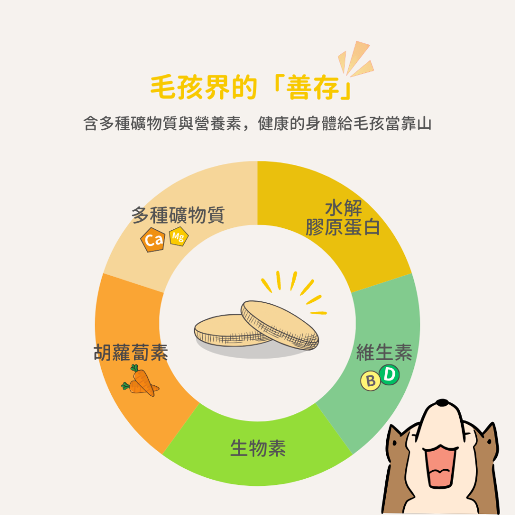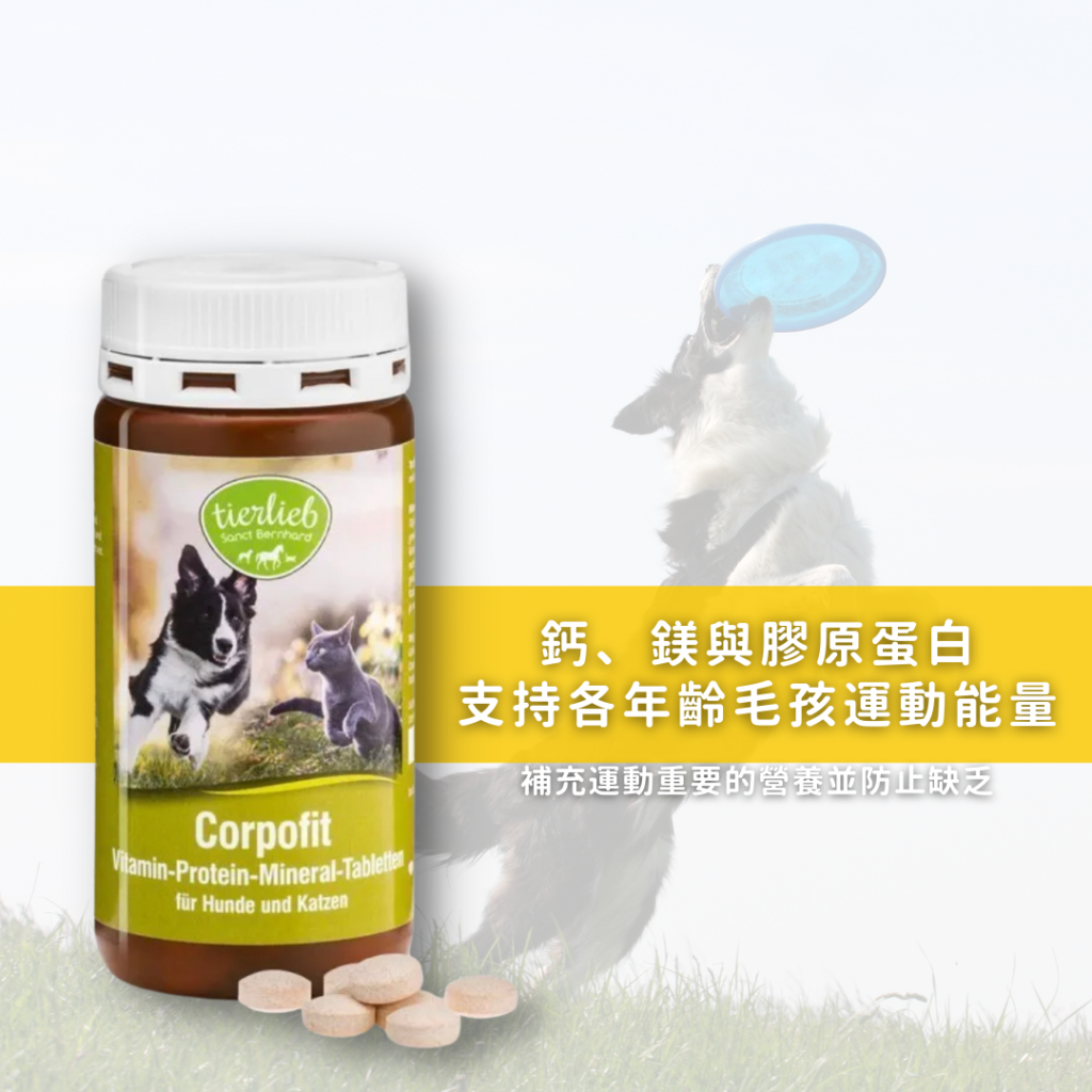 含有鈣、鎂、膠原蛋白、維他命與礦物質,可以支持各年齡層貓咪與狗狗的活動量,維持活力。同時幫助神經系統,穩定骨骼、關節、牙齒和指甲,並維持貓咪與狗狗新陳代謝,維持均衡營養。