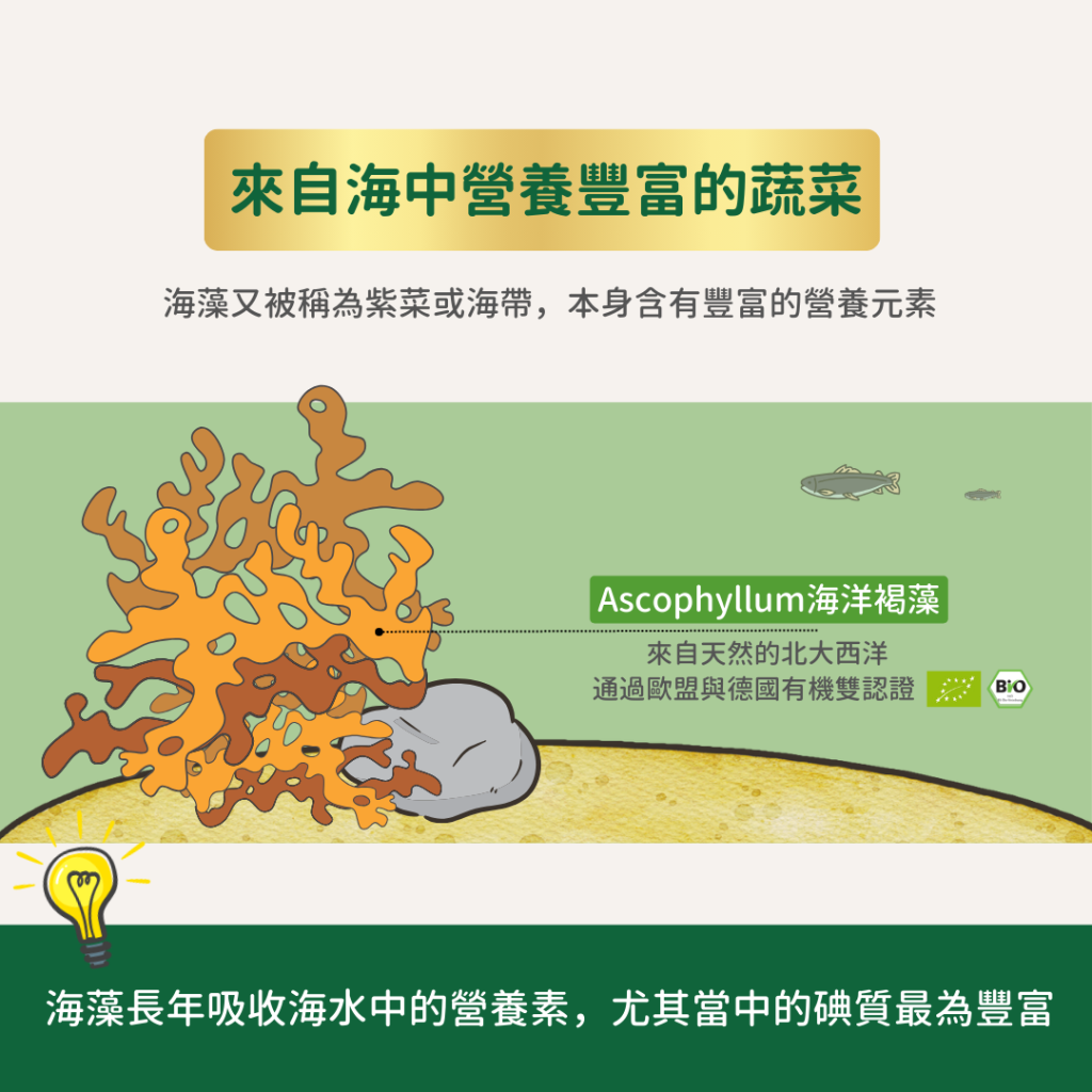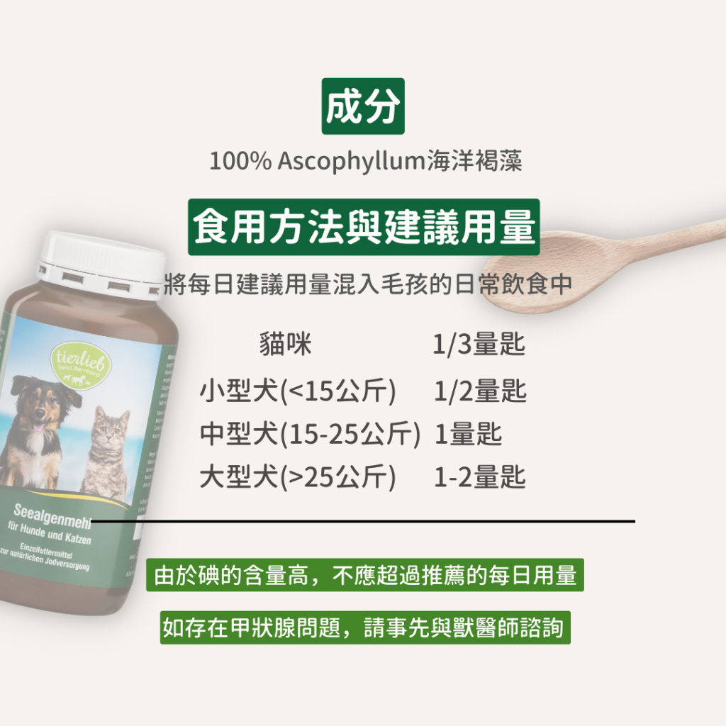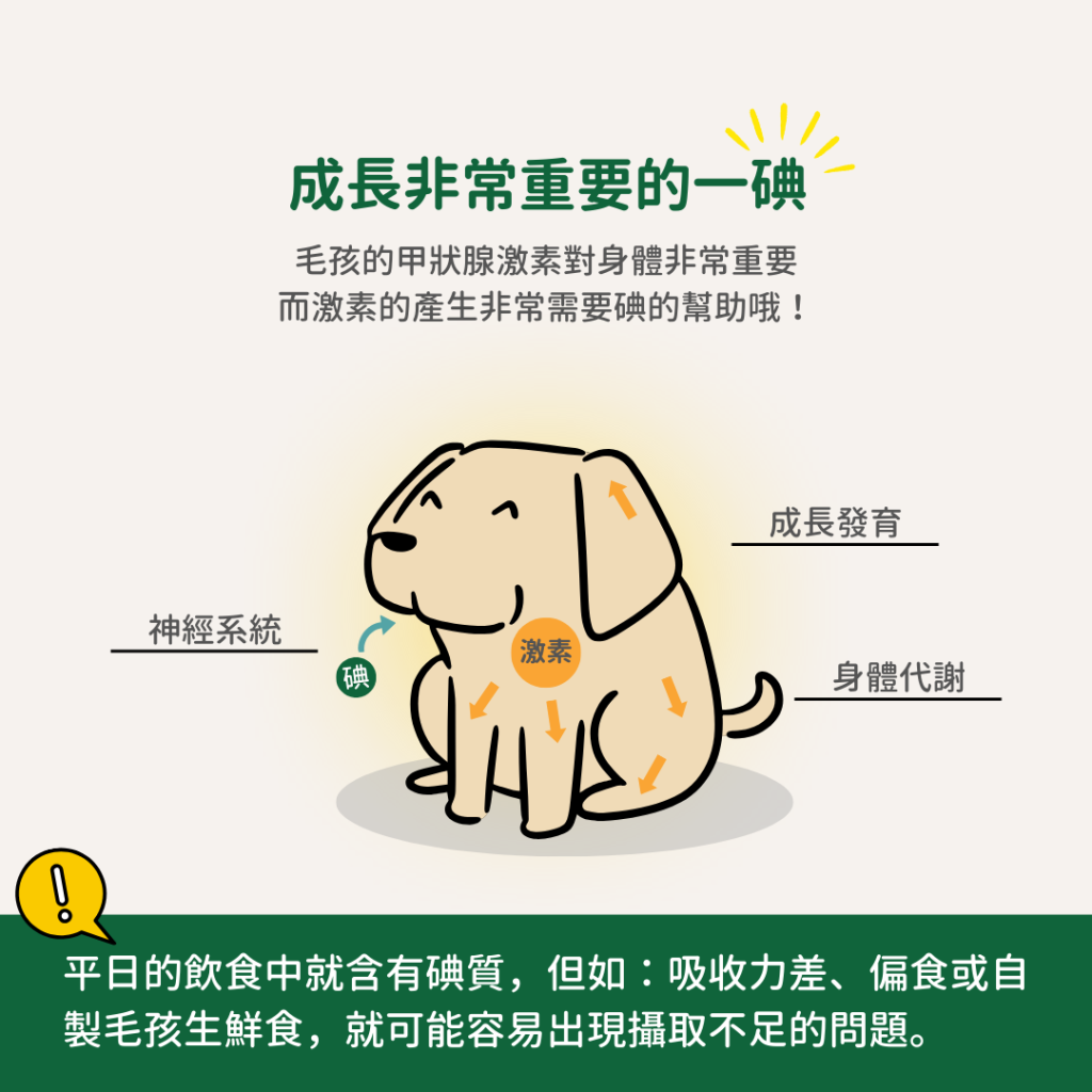 碘為毛孩分泌甲狀腺激素的必要微量元素之一,健康的甲狀腺激素對毛孩能量代謝、照護神經系統及健康發育非常重要。自製犬貓生鮮食也需隨時注意碘是否攝取足夠。天然海藻營養粉從海洋褐藻 (Ascophyllum) 中萃取,高品質不含任何添加劑,補充毛孩體內對碘的需求,並防止碘缺乏延伸的相關問題。