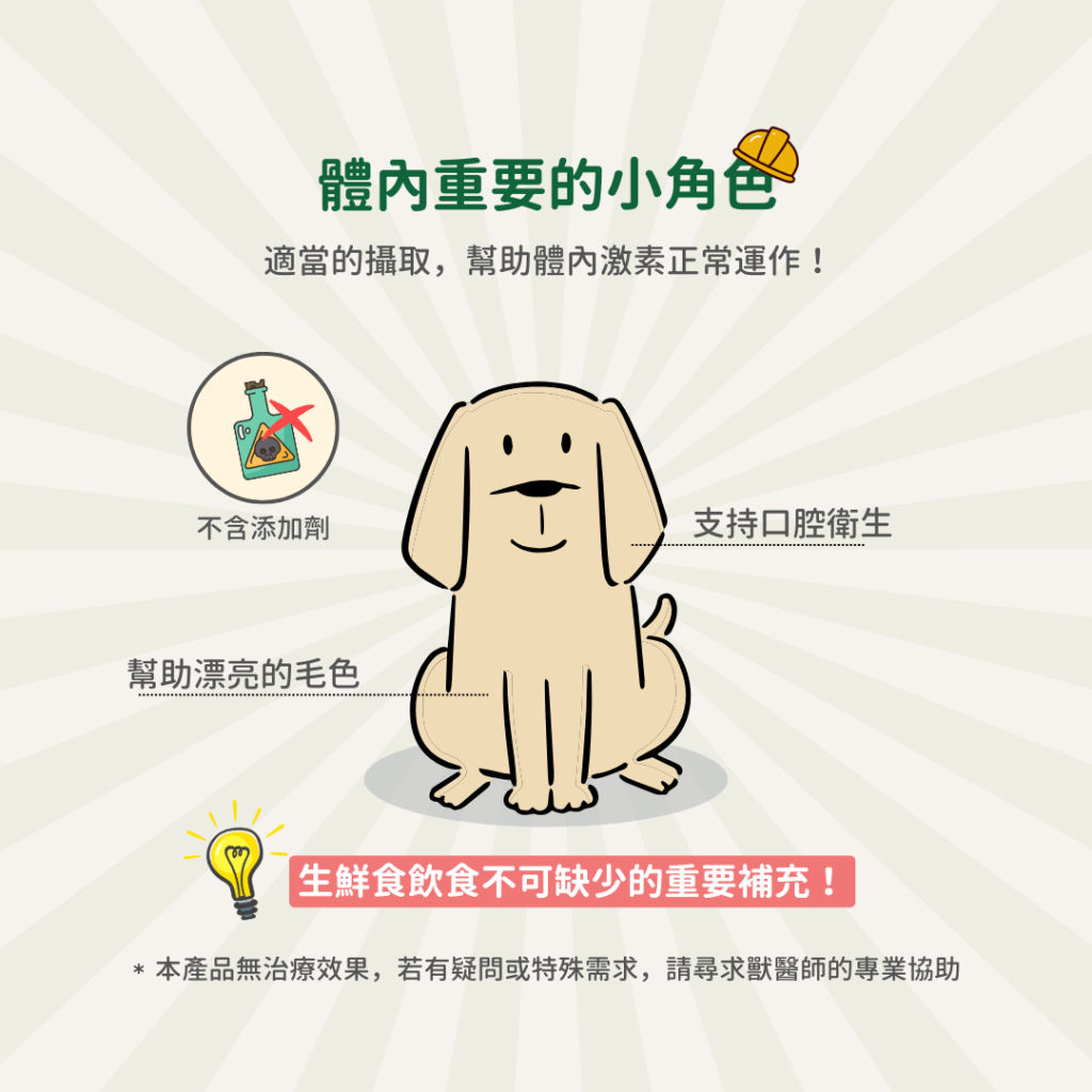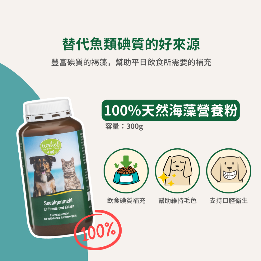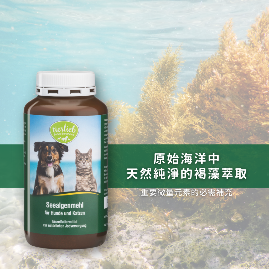 碘為毛孩分泌甲狀腺激素的必要微量元素之一,健康的甲狀腺激素對毛孩能量代謝、照護神經系統及健康發育非常重要。自製犬貓生鮮食也需隨時注意碘是否攝取足夠。天然海藻營養粉從海洋褐藻 (Ascophyllum) 中萃取,高品質不含任何添加劑,補充毛孩體內對碘的需求,並防止碘缺乏延伸的相關問題。