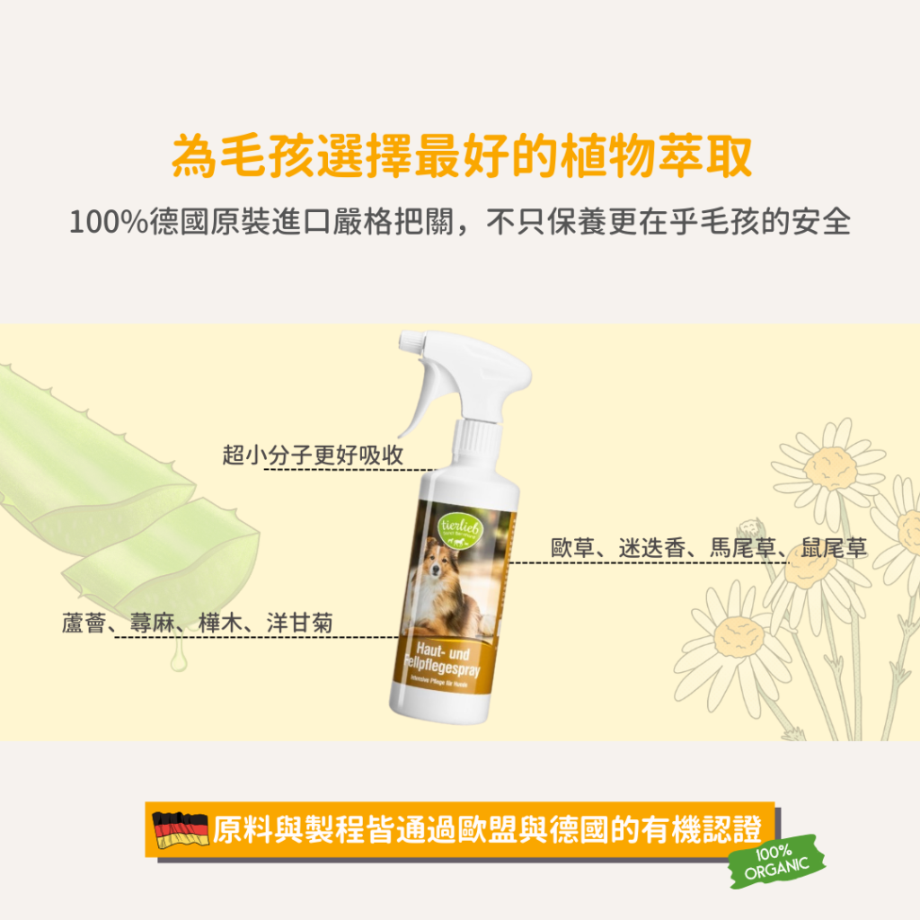 保濕護毛噴霧含有維他命B5精華,可以維持皮膚彈性與健康,幫助梳理並使毛髮光滑柔軟。其中含有多種天然草本萃取,蘆薈、蕁麻、樺樹、洋甘菊、西洋蓍草、迷迭香、馬尾草和鼠尾草等等,溫和的呵護肌膚。可定時使用保護皮膚,減少乾燥所產生的皮屑。