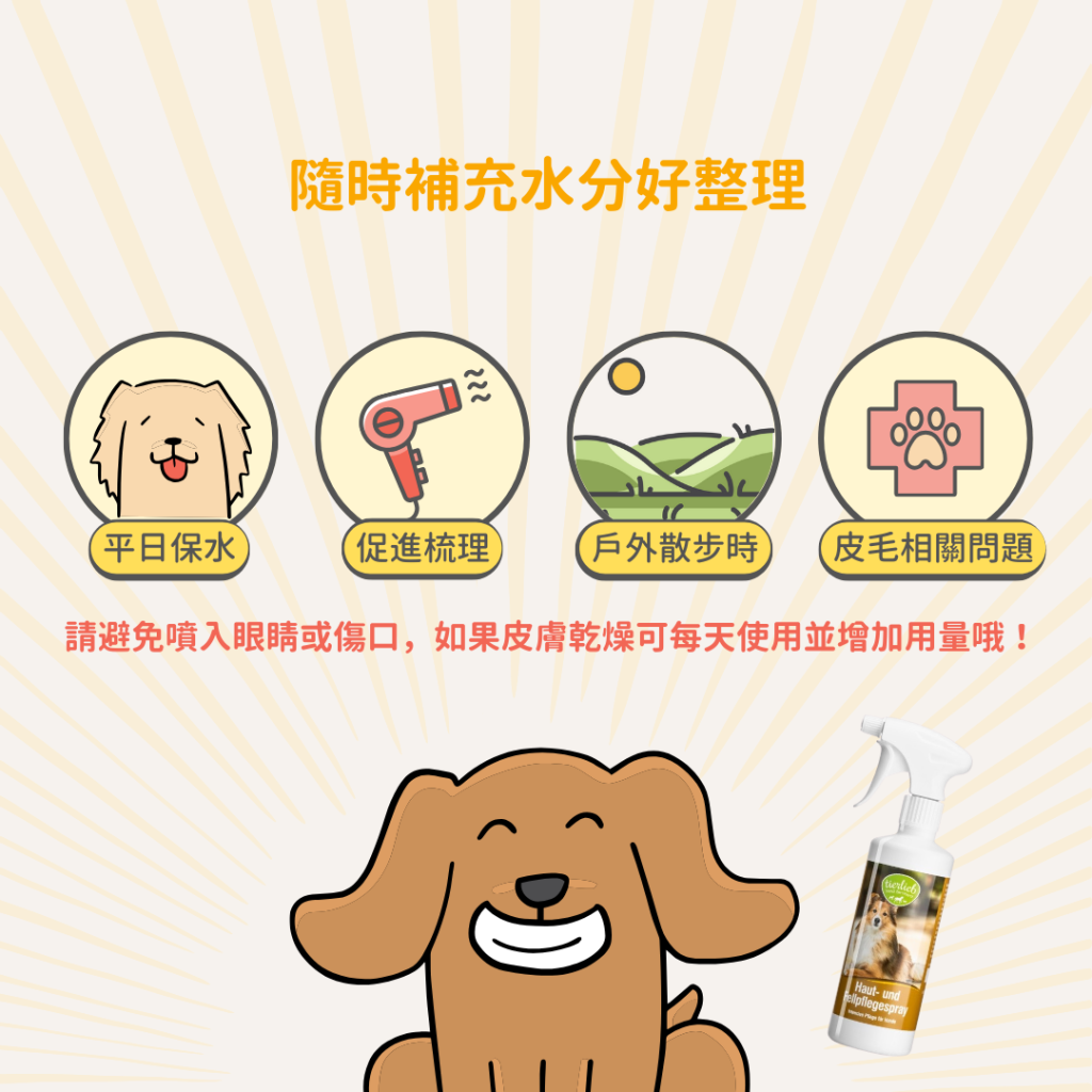• 距離皮毛高度20-30公分順著毛流方向均勻噴灑 • 如果皮膚乾燥可每天使用並增加用量
