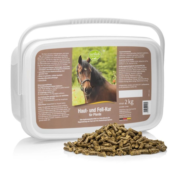 皮膚及毛髮、皮脂腺和汗腺,是一層具有保護性但易受損且脆弱的表面。馬用皮膚毛髮營養補充劑有助於再生皮膚和毛髮並恢復其功能。綜合營養素支持身體的防御能力並有助於保持皮膚健康。