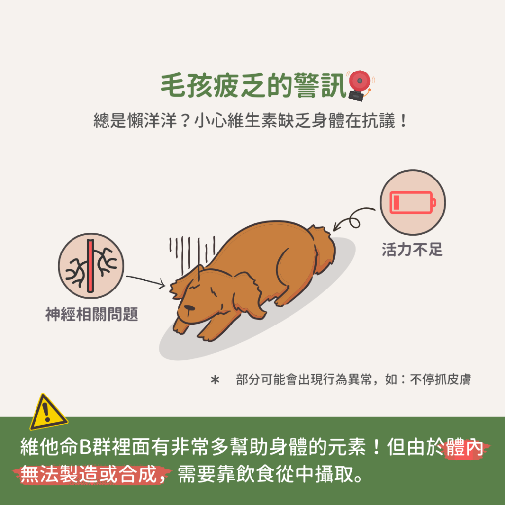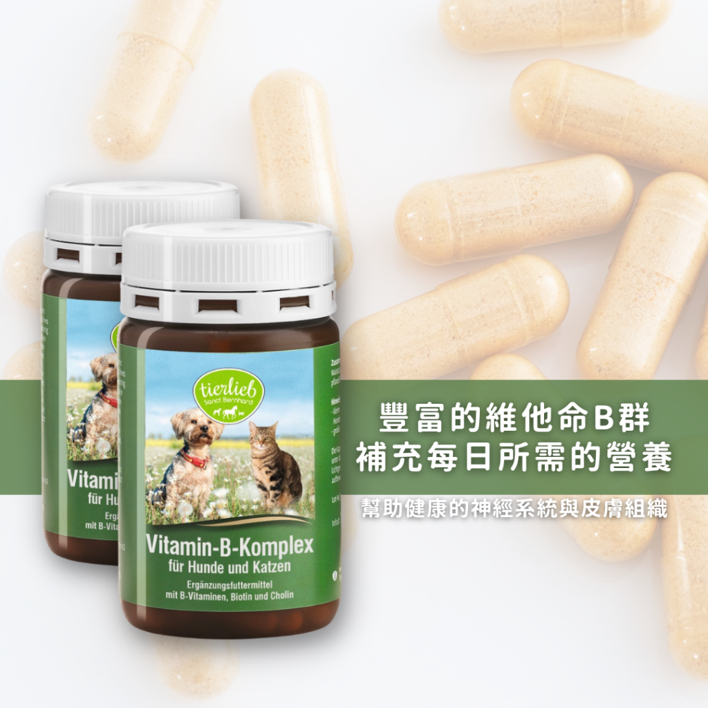 充足的維生素B對貓狗的新陳代謝和全身活力非常重要,同時也與體內神經系統、皮膚、粘膜組織習習相關,在貓狗懷孕、成長時期對維他命B群的需求也會大大增加。如果狗貓缺乏維生素B可則能會出現吃便溺物或不斷抓自己的皮膚等相關行為。