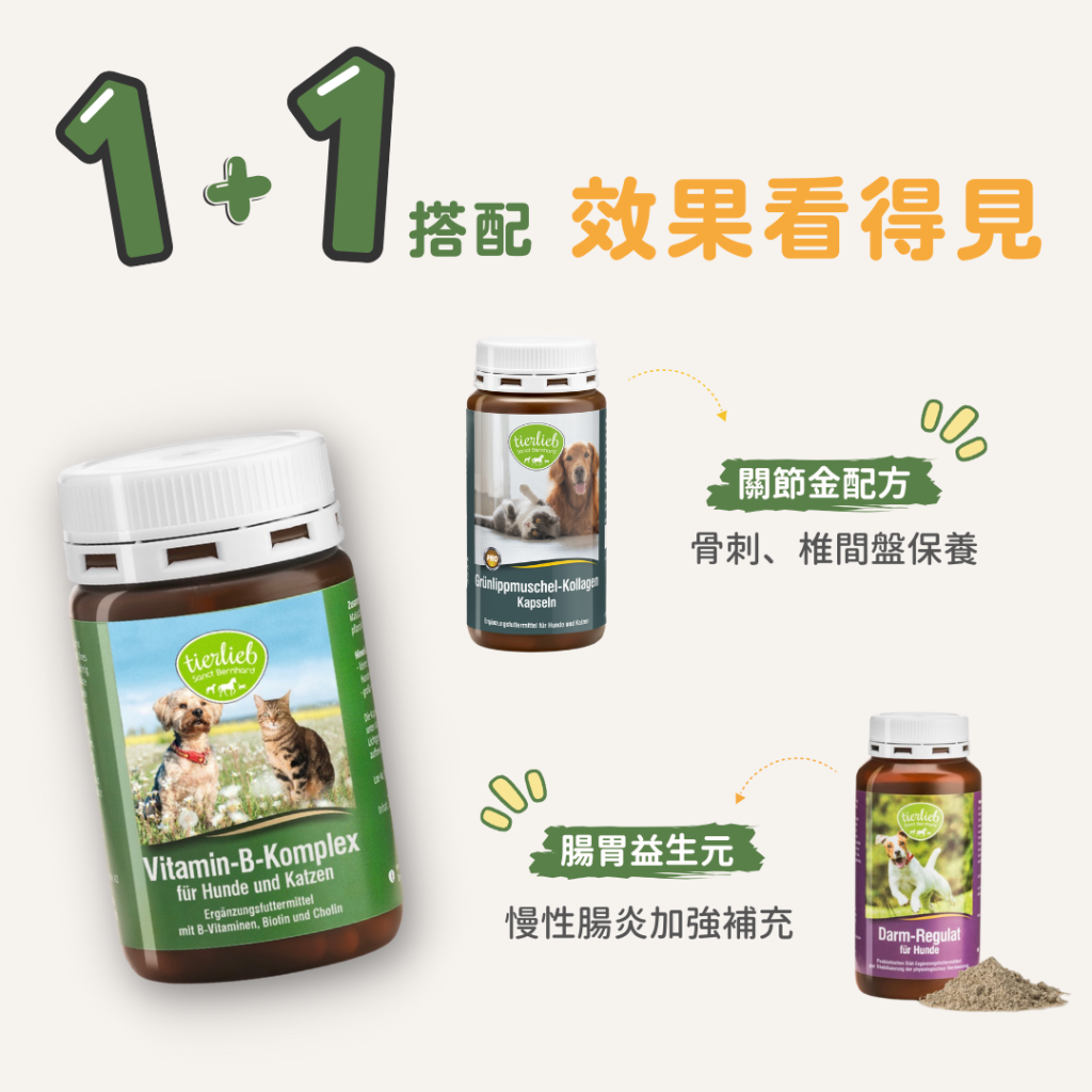 德國動物好朋友綜合維生素B膠囊含有均衡的維生素B群、膽鹼、生物素,可以增進皮膚健康、保護肝臟。