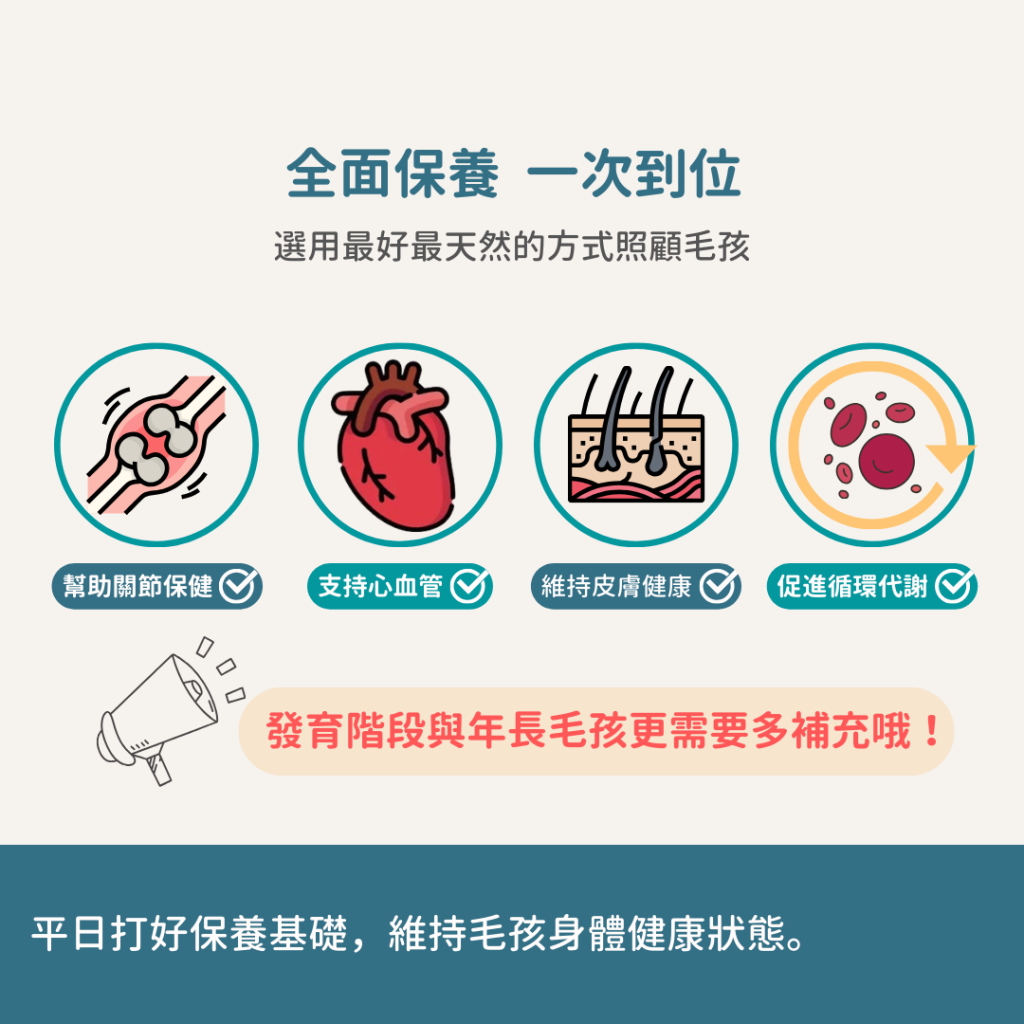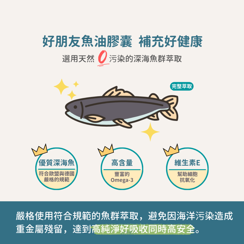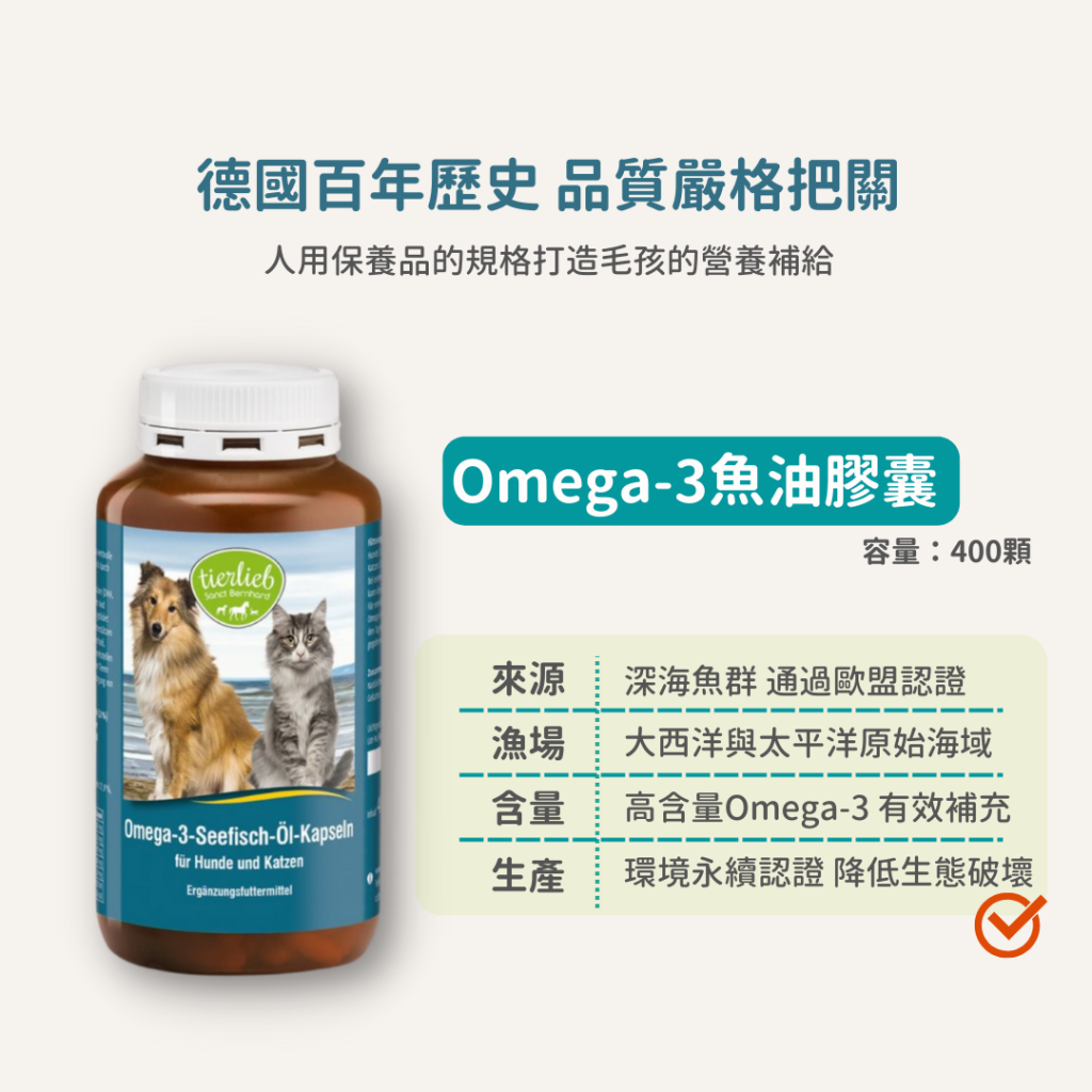 德國動物好朋友魚油萃取自大西洋與太平洋無污染深海魚群,含有豐富Omega-3脂肪酸,並包含有了EPA二十碳五烯酸(18%)和DHA二十二碳六烯酸(12%),這些重要的脂肪酸無法透過體內合成或自行製造,對貓狗而言非常重要不可缺少。特別是在成長發育的階段中,EPA和DHA能夠支持正常發育,提供養分以及維持正常的脂肪代謝,從而提供足夠的能量。不論是發育階段的幼犬、幼或是高齡犬貓,補充EPA和DHA可以為皮膚、心臟、循環代謝提供重要的營養。